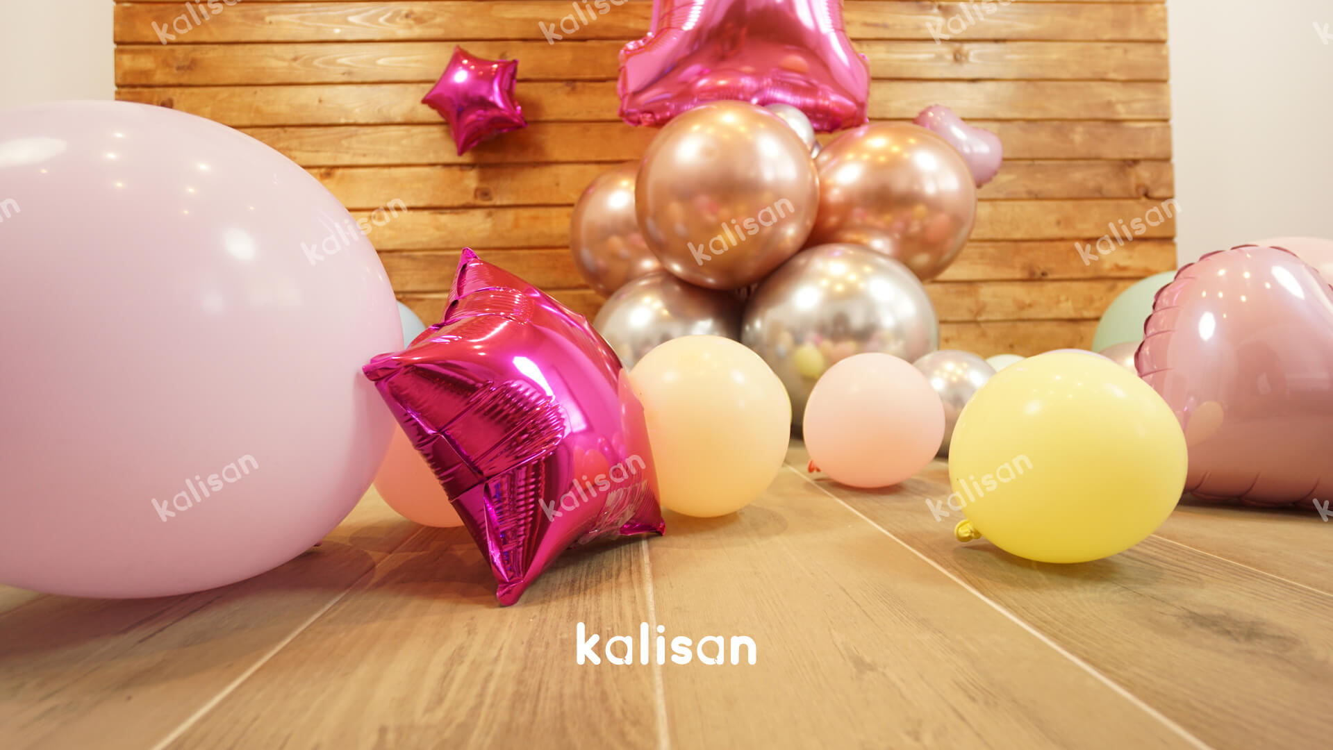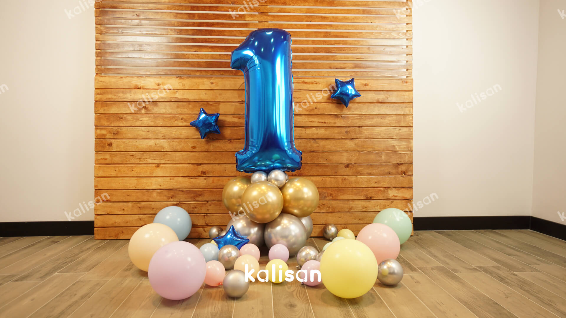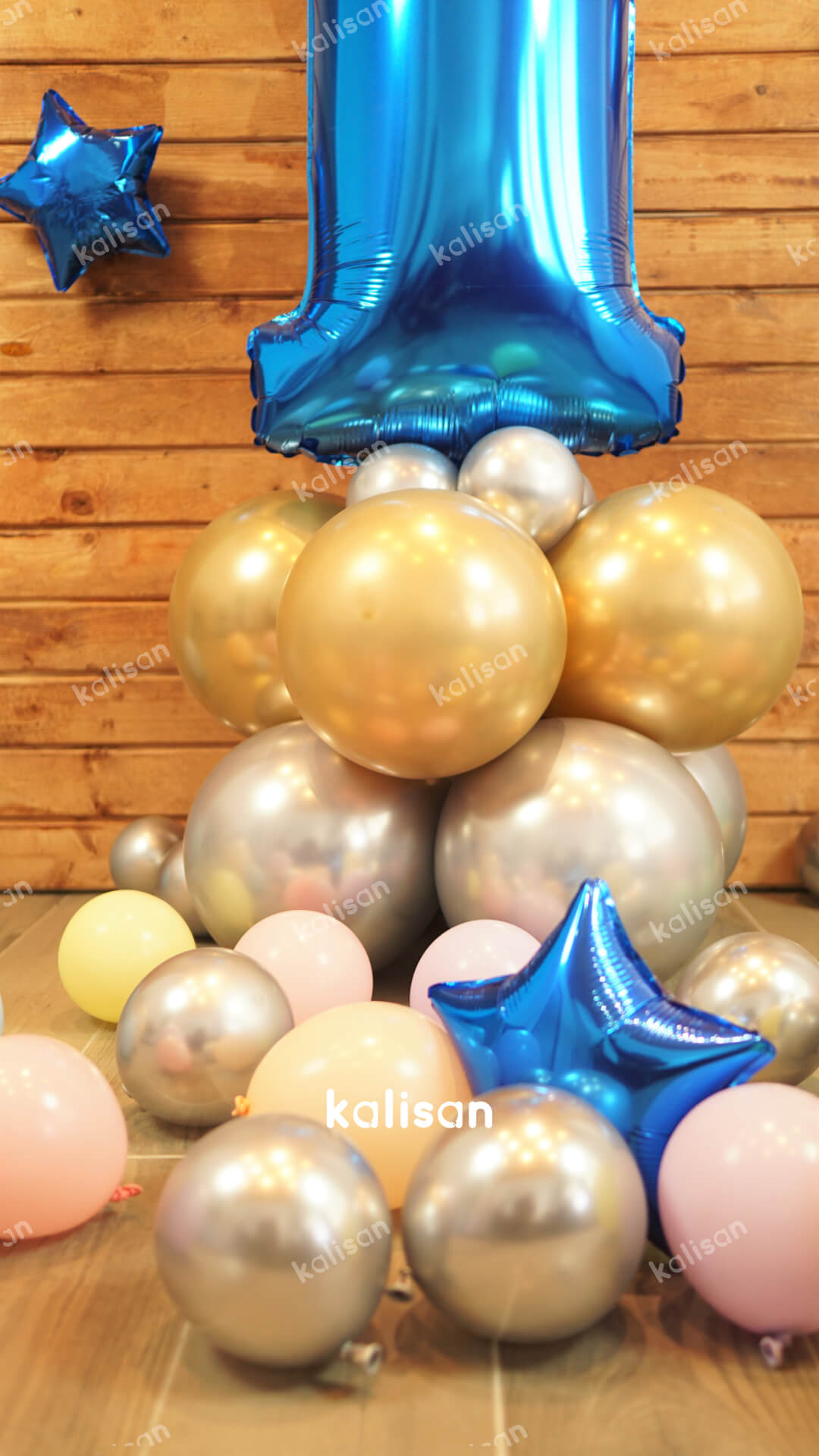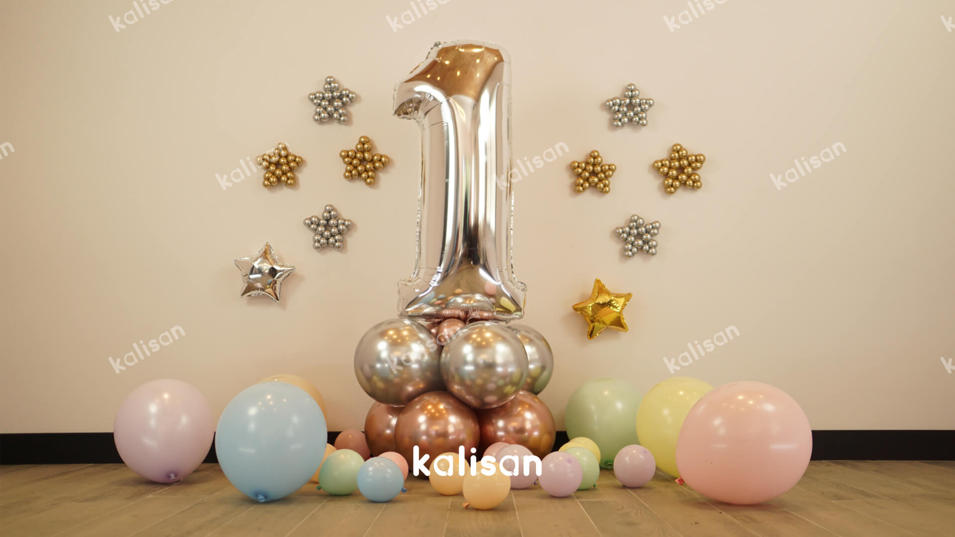 1 Yaş balon sütunlarında 12″ – 30 ve 5″ – 12 cm balonlar bir arada kullanılır. Alt sütun krom, makaron ya da standart renk grubuyla oluşturulabilir. Paket içi 4’lü satılan 4″ ve 3’lü satılan folyo yıldız ya da kalp balonlarla balon dekorunu tamamlanabilir. Parti dekor bölümünde bulunan kağıt banner, parti mumları, kağıt püskül ve konfeti gibi parti malzemeleriyle birlikte 1 yaş balon konsepti zenginleştirilebilir. 1 yaş folyo balonları paket içinden çıkan çubuk yardımıyla kolaylıkla şişirilebilir.