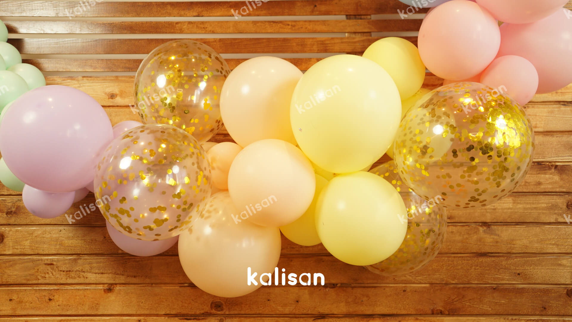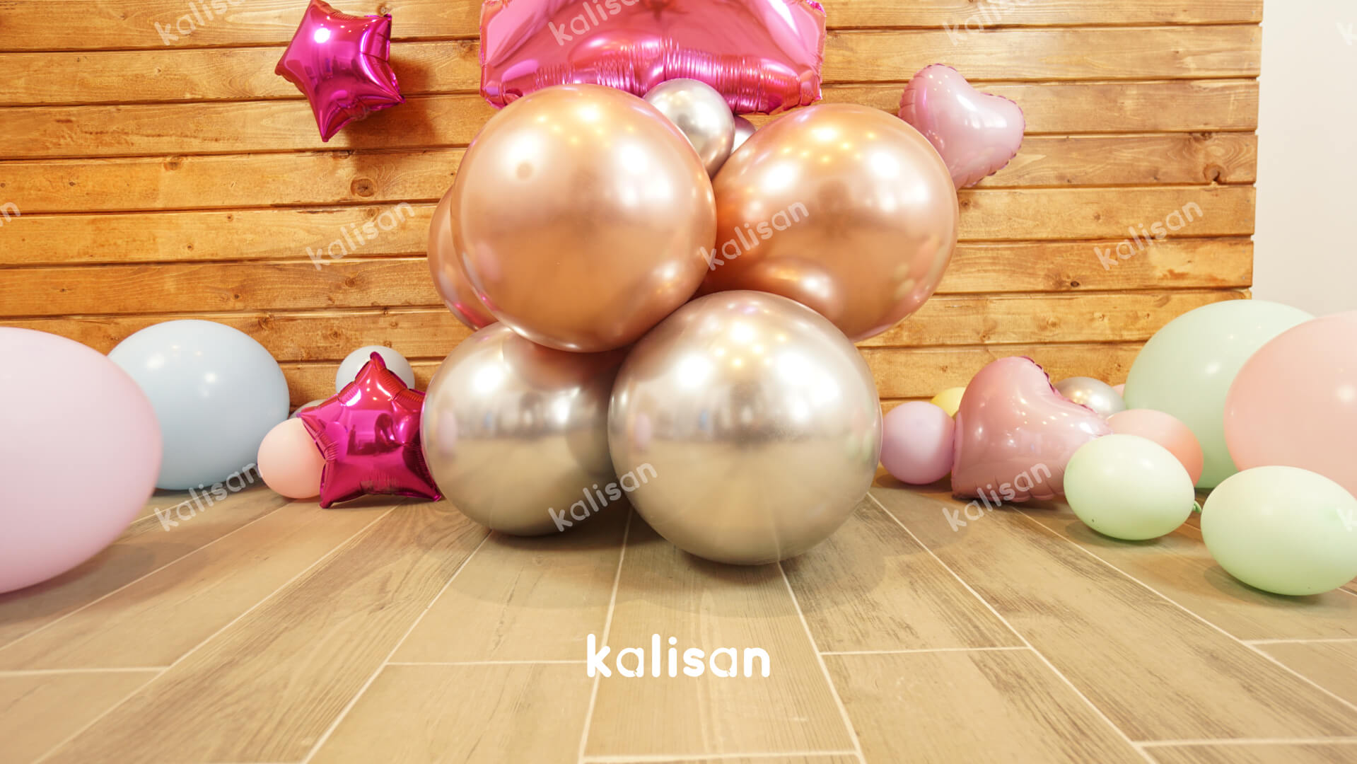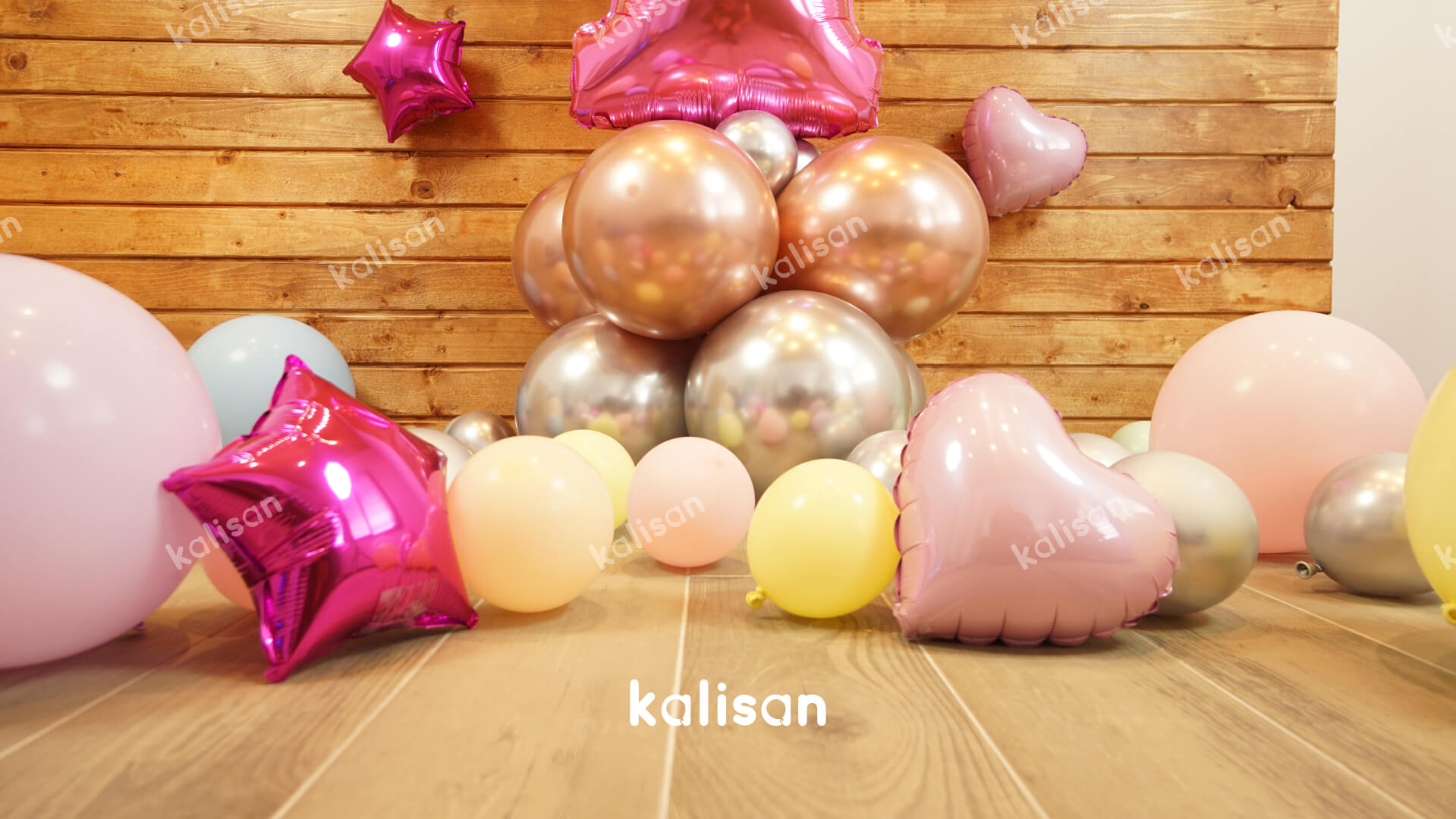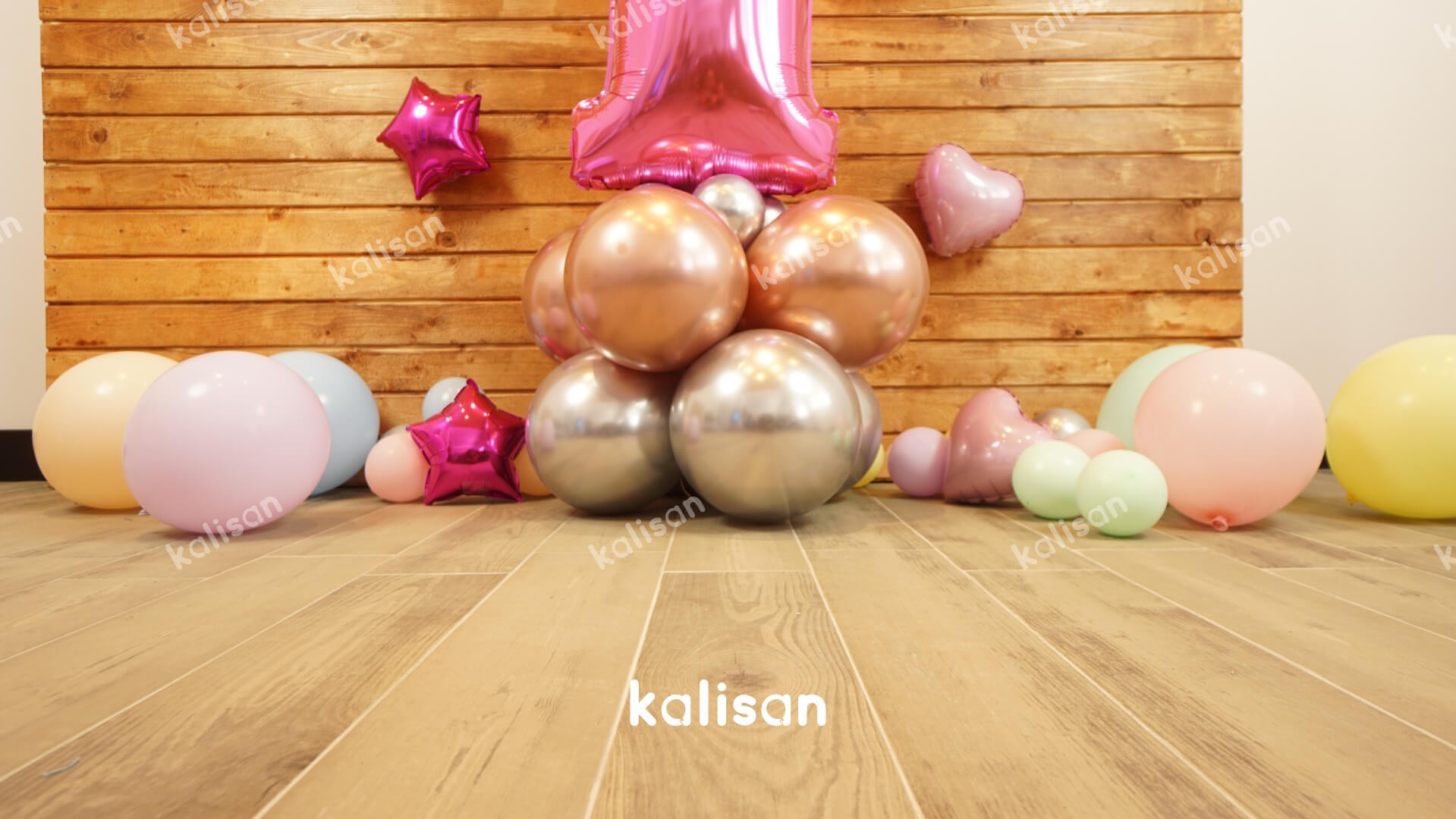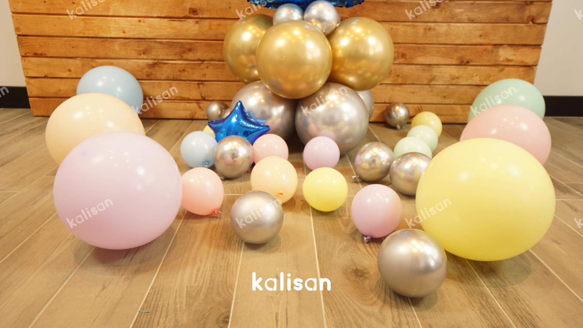 1 Yaş balon sütunlarında 12″ – 30 ve 5″ – 12 cm balonlar bir arada kullanılır. Alt sütun krom, makaron ya da standart renk grubuyla oluşturulabilir. Paket içi 4’lü satılan 4″ ve 3’lü satılan folyo yıldız ya da kalp balonlarla balon dekorunu tamamlanabilir. Parti dekor bölümünde bulunan kağıt banner, parti mumları, kağıt püskül ve konfeti gibi parti malzemeleriyle birlikte 1 yaş balon konsepti zenginleştirilebilir. 1 yaş folyo balonları paket içinden çıkan çubuk yardımıyla kolaylıkla şişirilebilir.
