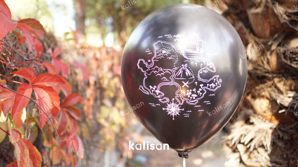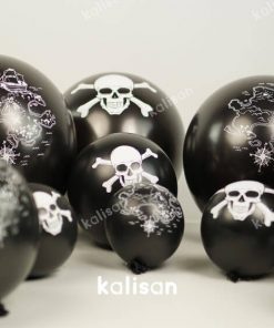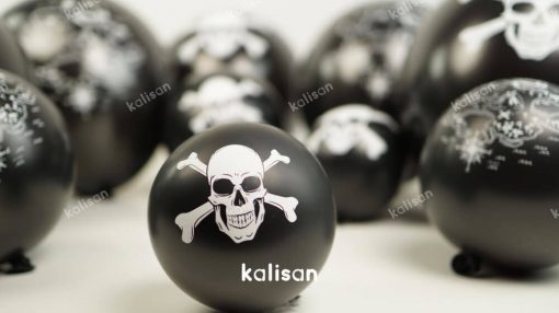 Korsan baskılı balonlarda siyah balona beyaz baskı rengi kullanılmaktadır. Ürün çift yüzeyli olup 2 farklı tasarım içerir. Korsan balonların bir yüzeyinde kurukafa; diğer yüzeyinde korsan temalı öğeler bulunmaktadır. Doğum günü, kutlama ve çeşitli organizasyonlarınızda korsan baskılı balonları kullanarak farklı bir tasarım oluşturabilirsiniz. 10’lu ve 25’li ambalajlarda Kalisan e-mağaza da satışa sunulur. Fiyatlar için ürün tablosunu inceleyin. Yerli üretimdir, Kalisan üretici adı ve markasıyla İzmir’de üretilir.
