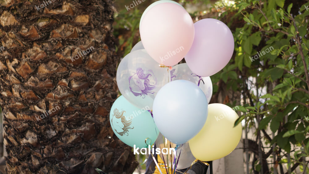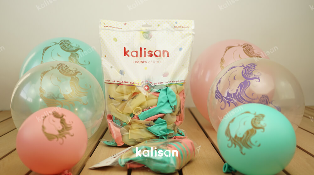 Unicorn temalı doğum günü balonları 4 farklı şekilde üretilir Şeffaf balona gold ve mor, bebek pembe ve deniz köpüğü balonlara gold baskılıdır. Paket içi karışık olarak satışa sunulur. Tasarım, balonun çift yüzeyindedir ve 3,2 gr – 3,3 gr ağırlığındaki 12″ – 30 cm balonlar kullanılır.